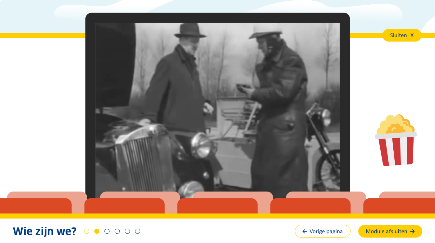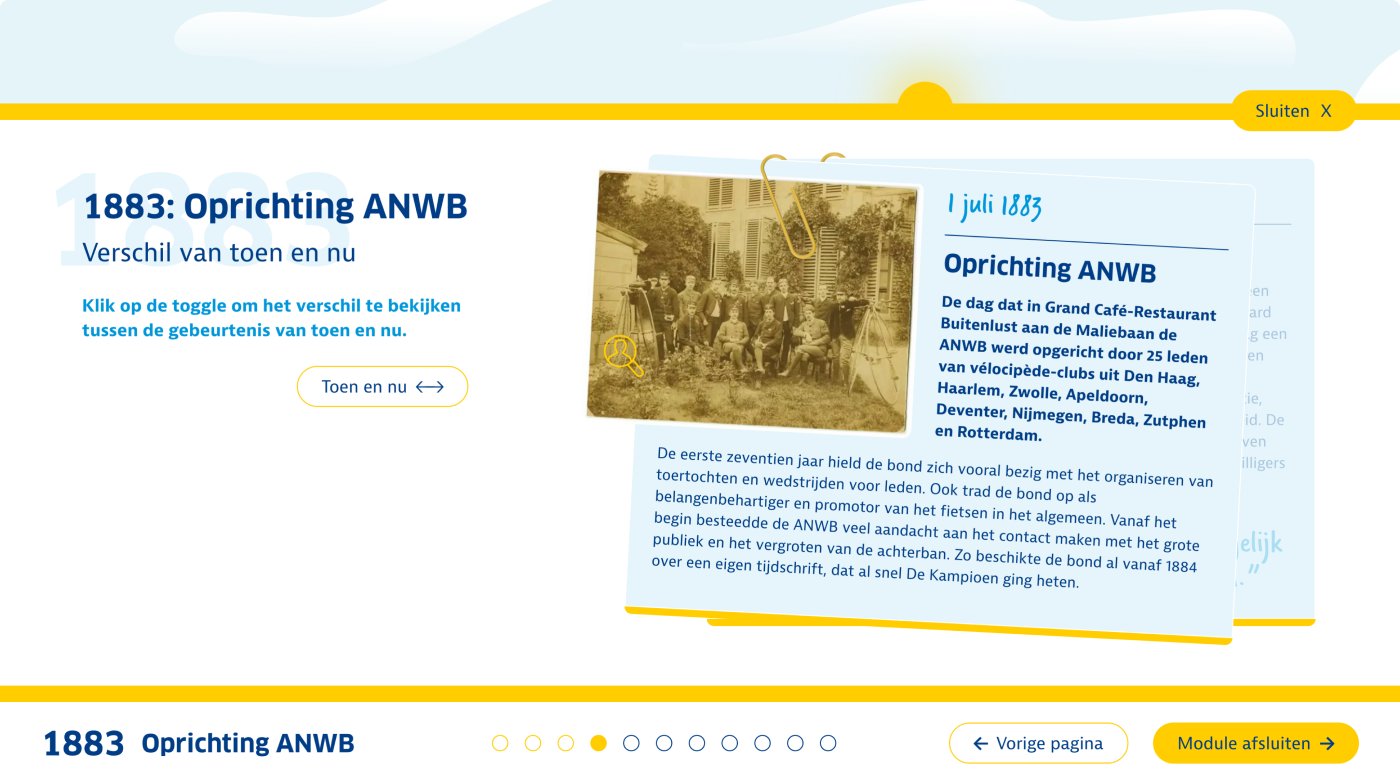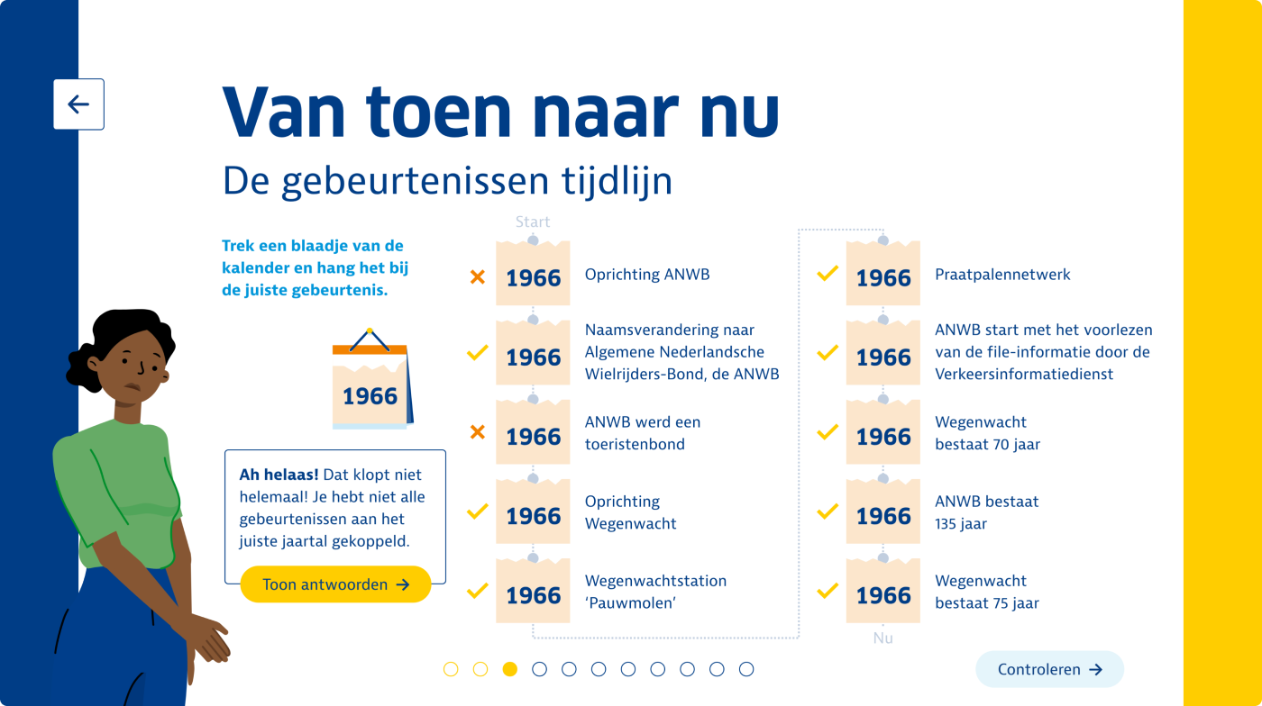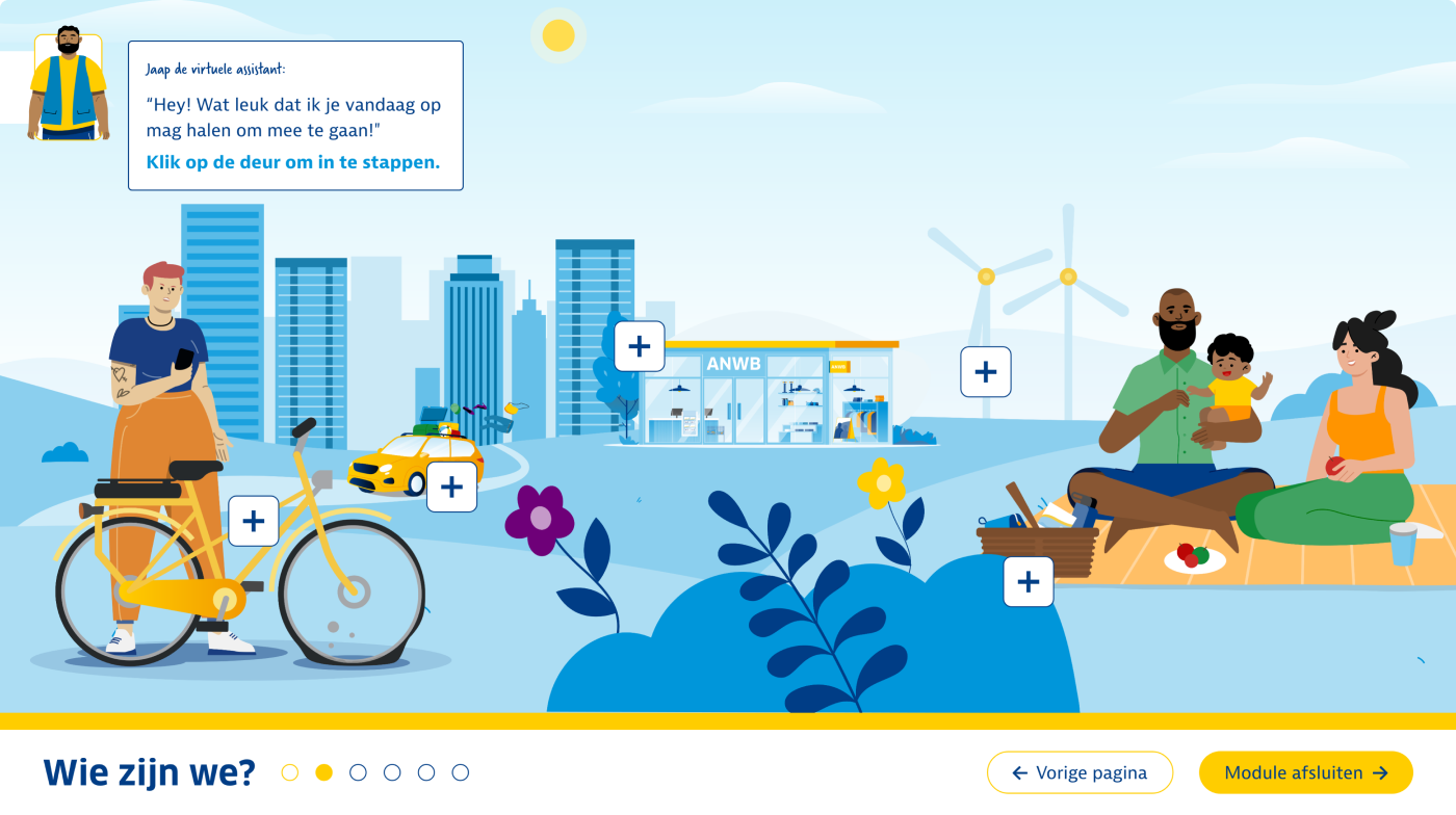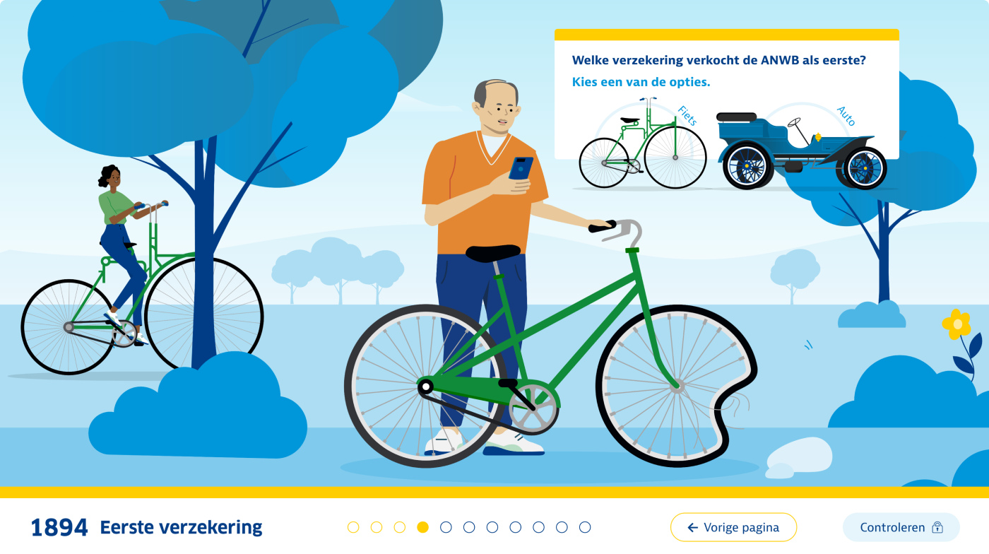De onboardingsmodule ‘Welkom bij de ANWB’ bestaat uit een serie korte leerinterventies die flexibel en in eigen tempo te volgen zijn. In twee interactieve animaties maken deelnemers een reis door de wereld van de ANWB. Tijdens de eerste reis neemt een virtuele assistent hen in een iD4-busje mee langs de organisatie. Deelnemers ontdekken wie de ANWB is, wat ze doet en waar ze voor staat. De tweede reis voert langs de rijke geschiedenis van de ANWB. Deelnemers stappen in (of op) een klassiek vervoersmiddel en bezoeken tien belangrijke mijlpalen – van de oprichting in 1883 tot de transformatie naar platformorganisatie in 2023. Tijdens deze tocht ontdekken ze hoe deze kerngebeurtenissen van invloed zijn geweest op de ANWB van vandaag. Voor elke voltooide mijlpaal ontvangen deelnemers een ‘upgrade’ van hun voertuig als beloning.