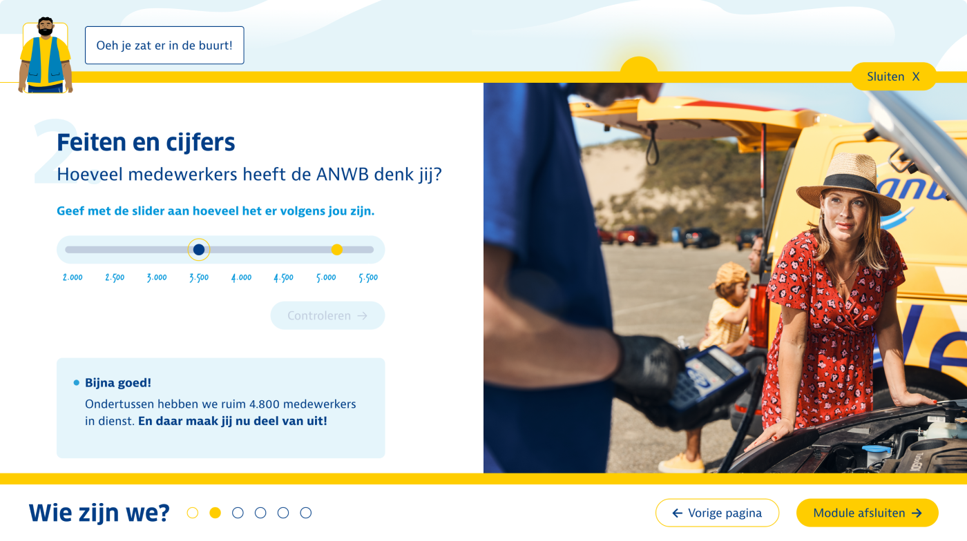 Door de combinatie van interactieve animaties en microlearnings is de onboardingsmodule het visitekaartje van de organisatie geworden: een modern, uitnodigend en inspirerend begin dat nieuwe medewerkers verbindt, motiveert en trots maakt om voor de ANWB aan de slag te gaan.